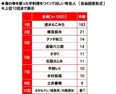 また、全回答者(1,000名)に、海の幸を使った手料理をつくってほしい有名人を聞いたところ、「速水もこみちさん」がダントツ、2位「梅宮辰夫さん」、3位「グッチ裕三さん」と「道場六三郎さん」、5位「タモリさん」と「石原さとみさん」となりました。