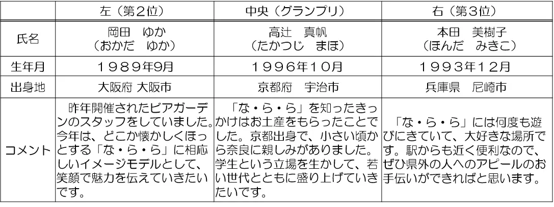 今回決定した「な・ら・ら」イメージモデルの3名は、任期の2018年3月まで、本施設を盛り上げるために、広告物へのモデル出演やイベントへの登壇など、様々な分野で活躍していただく予定です。