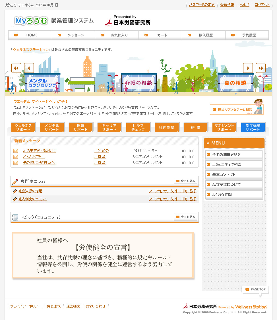 2009年12月22日 11:00企業の人事労務管理アウトソーシング事業を展開する株式会社 日本労務研究所(本社:東京都新宿区、代表取締役:奥山 恵一、以下 日本労務研究所、 http://www.n-roumu.com/ )は、医療・健康分野のWEBコミュニティ事業を展開する株式会社日本エンブレース(本社:東京都目黒区、代表取締役:伊東 学、以下 日本エンブレース、 http://www.embrace.co.jp/ )と業務提携を行い、日本労務研究所の就業管理パッケージの提供に、日本エンブレースの健康増進WEBコミュニティプラットフォーム「ウェルネスステーション(TM)」を採用し、企業の人事労務部門が必要とする全てのサービスをWEBポータルとしてワンストップで提供する新しいサービス「Myろうむ」の提供を、2009年12月24日から開始することを発表いたします。