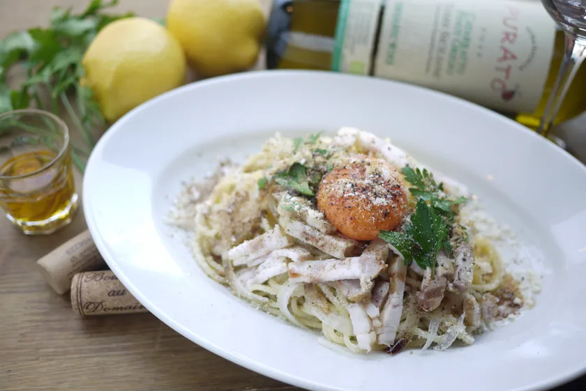 徳島県阿波美豚の無添加ベーコン、デュラムセモリナ粉の中心部のみを贅沢に使った生パスタを使用。