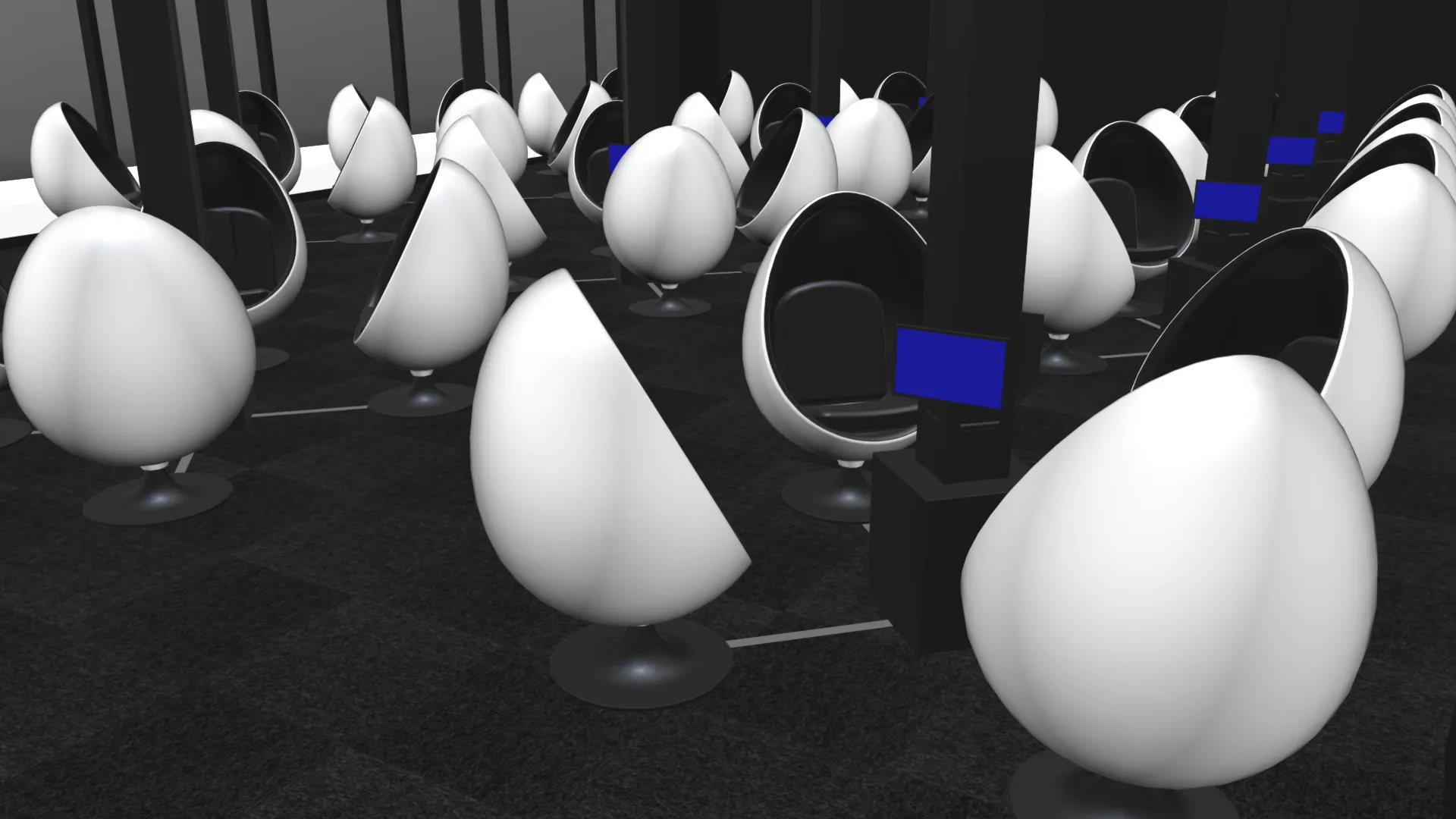 「コニカミノルタ VirtuaLink in ダイバーシティ東京 プラザ」では、36人が同時に体験できる空間を2エリア設け、座席を72席ご用意しました。たまご型チェアが並ぶ姿は非日常感を高め、東京スカイツリータウンでも、ご好評をいただいております。