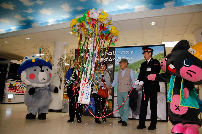 横山さん夫妻は2泊3日の日程で大町市を訪れており、今回が初めてのトロリーバス乗車だということで「ずっと黒部ダムに行きたいと思っていたが、まさか6,000万人目になるとは思ってもみませんでした。天気もいいしダムの観光放水など楽しみたいです」と話していました。