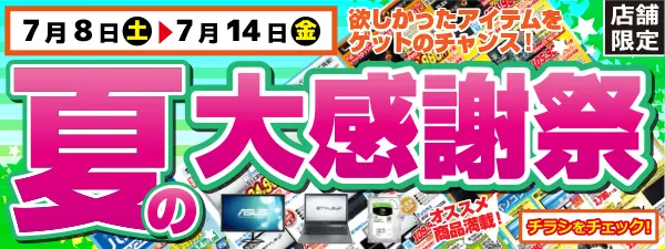 パソコン工房・グッドウィルの各店では、7月8日(土)からも引き続き「夏の大感謝祭」を開催中です。欲しかったアイテムゲットのチャンス!7月8日(土)・9日(日)限定の特価品もご用意しています。