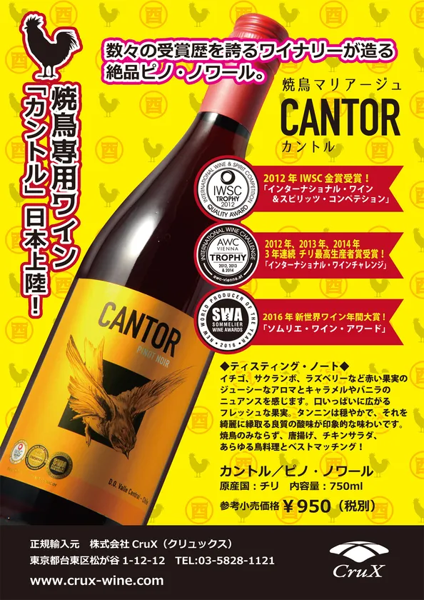 2017年7月11日 10:00株式会社CruX(本社:東京都台東区、代表取締役:関口 智也)は、“焼鳥専用”ワインとして、チリワイン「カントル/ピノ・ノワール」を2017年6月に販売開始いたしました。