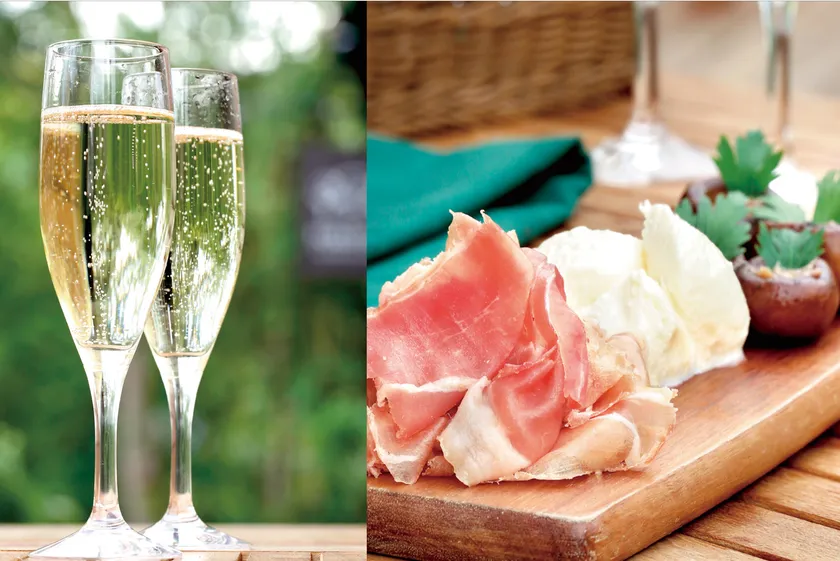 イタリア産のスパークリングワインと生ハムが川岸に立地するお店でおかわり自由に