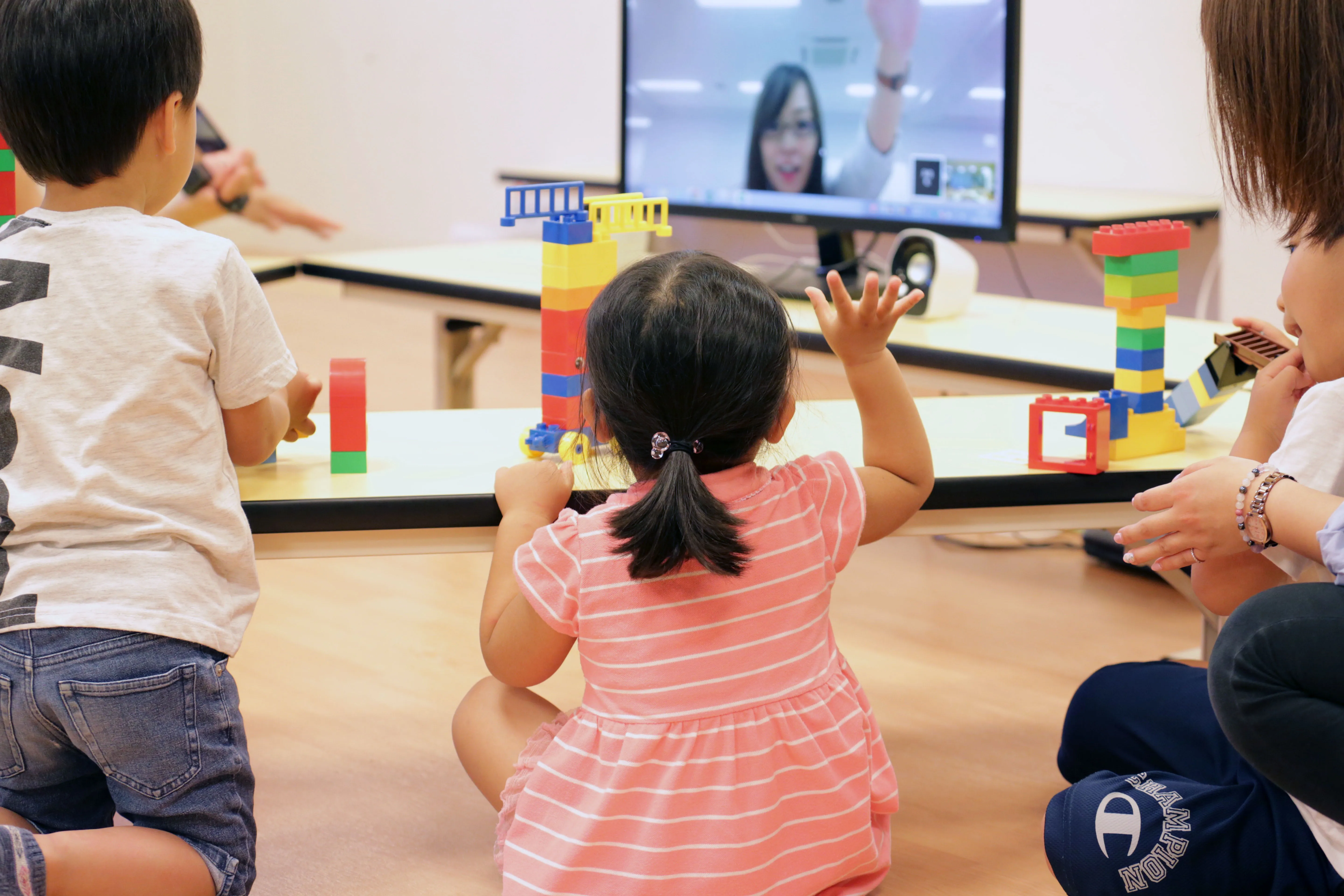 画面の中の先生がえいごを使って身振り手振りでブロックづくりを教えてくれます。