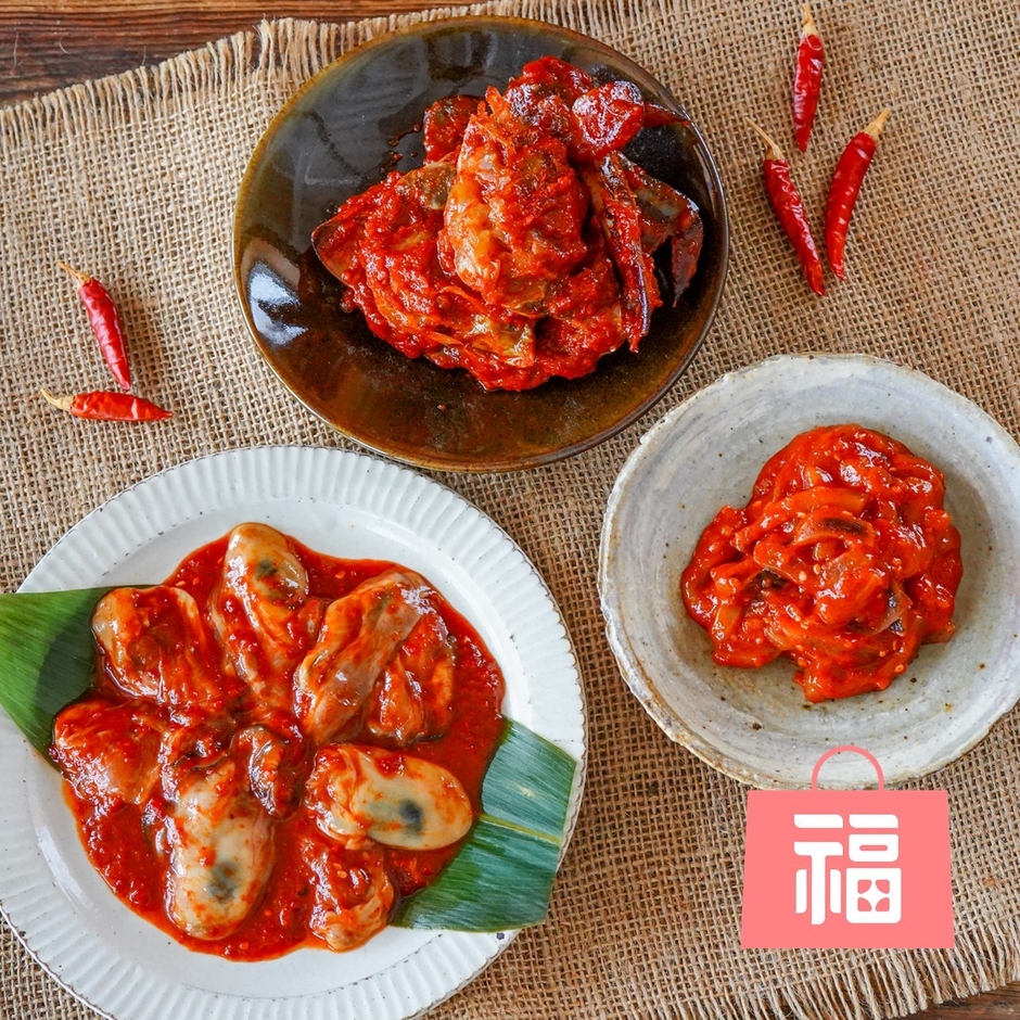 国産の生牡蠣を使った「牡蠣キムチ」、秘伝のヤンニョムで漬けた本場韓国の味「ケジャン」、コクと旨みが好評の「いかキムチ」、人気の海鮮キムチを詰め込んだ豪華福袋!1960年から続く伝統の味をお得に3種類も楽しめる内容になっています。