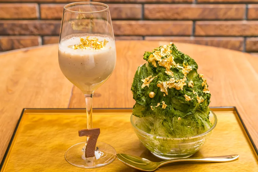 「宇治抹茶の宝当かき氷」は、宝くじにご利益があると言われる、佐賀県唐津市の宝当神社を有する島「高島」をイメージ。金箔の切り廻しとゴールドに輝くアラザンショコラ、さらには縁起の良い大福が入った、宝箱のようなかき氷ができました。宝物を発掘するトレジャーハンターのように、金運アップ食材を見つける楽しさが味わえるかき氷です。