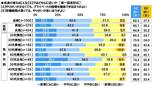 次に、《【A】やりがいが少なくても、プライベートの時間を確保できるほうがよい【B】労働時間が長くても、やりがいが多いほうがよい》についてみると、『Aに近い(計)』は62.5%(「非常にAに近い」20.1%、「ややAに近い」42.4%)、『Bに近い(計)』は37.5%(「非常にBに近い」6.2%、「ややBに近い」31.3%)となりました。やりがいが多いことより、プライベートの時間を確保できることのほうがよいと考えている人が多いようです。