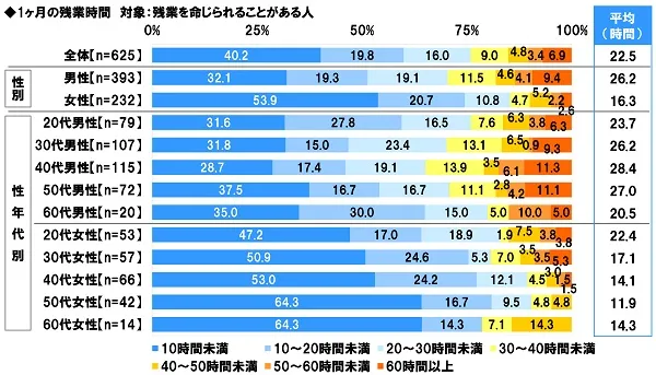 次に、残業を命じられることがある人(625名)の1ヶ月の残業時間をみると、「10時間未満」が40.2%で最多回答になりましたが、「60時間以上」といった特に長い時間の回答も6.9%みられ、平均残業時間は22.5時間でした。