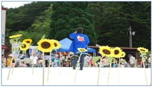 「夏の花の代表格」であるひまわりの切り花を300本使用して、雪広場にお花畑を造ります。ひまわりの華麗な黄色が真っ白な雪に映え、夏らしさと涼しさの両方が楽しめます。摘み取ったひまわりは、宝ものと同様、すべてプレゼントします。