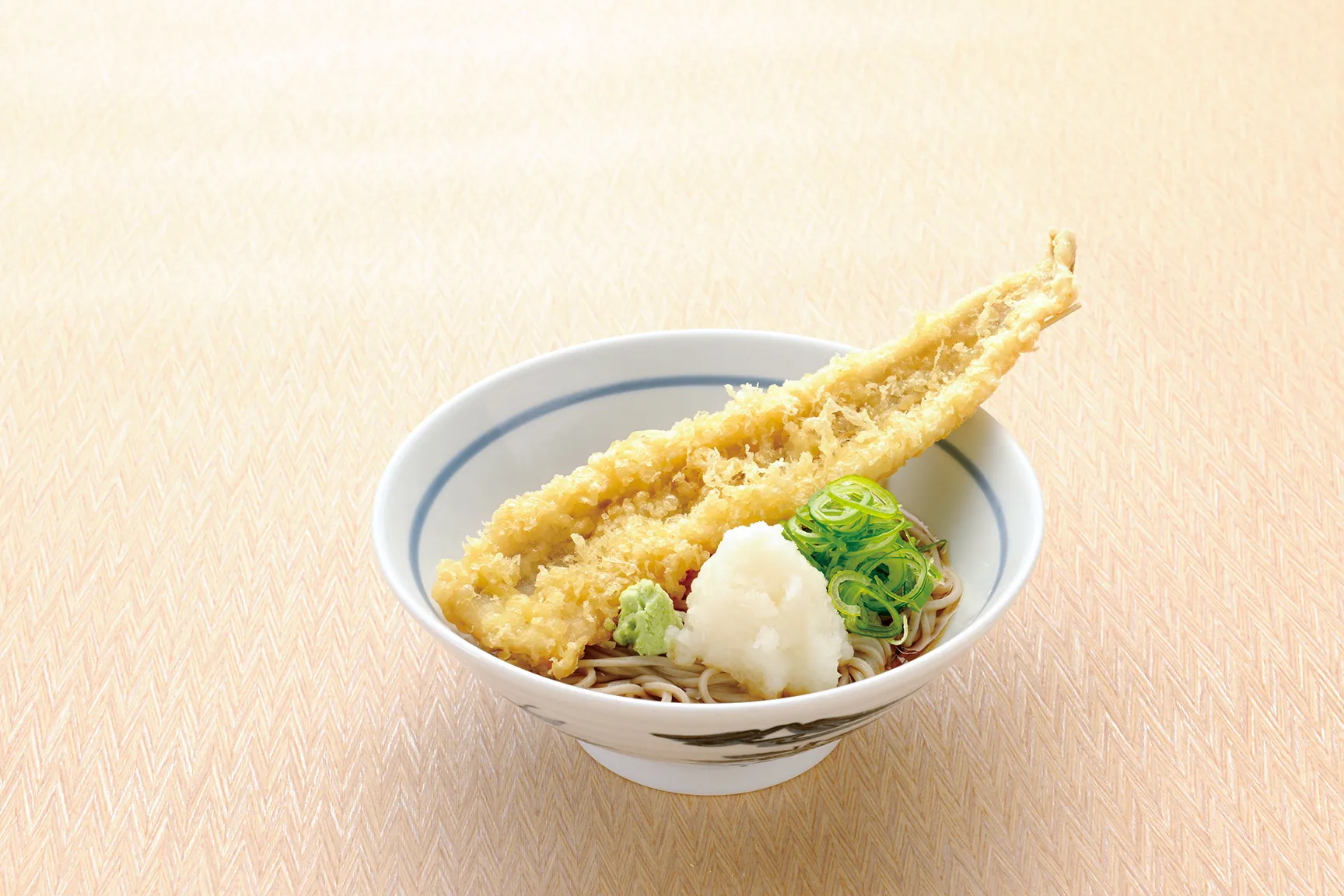 ボリューム満点の大きな穴子天を1本使用しております。穴子はビタミンAが豊富で、その上低カロリーで高タンパク質の食材です。この夏の暑い時期に、冷たいそば、大きな穴子天、そして大根おろしを豪快に混ぜてサッパリと頂けます。
