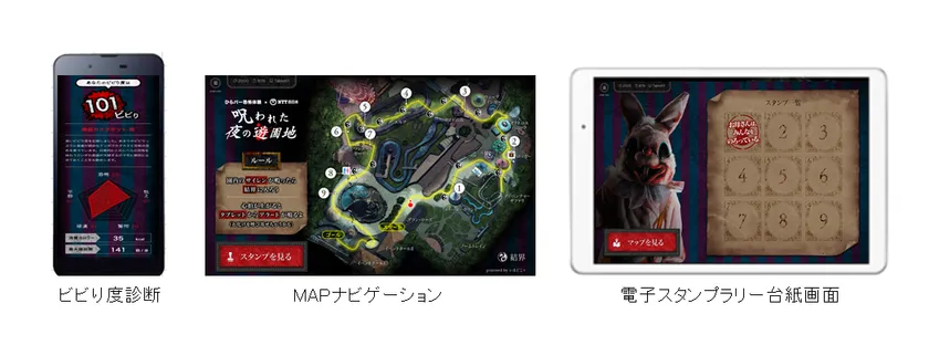 また、「呪われた夜の遊園地」<夜公演>では、GPSによる位置情報サービス「いまどこ+※3」により、体験者のグループごとに貸与したタブレット端末上でのMAPナビゲーションと「echoss Smart Stamp※4(以下、スマートスタンプ)」を活用した電子スタンプラリーを実現します。