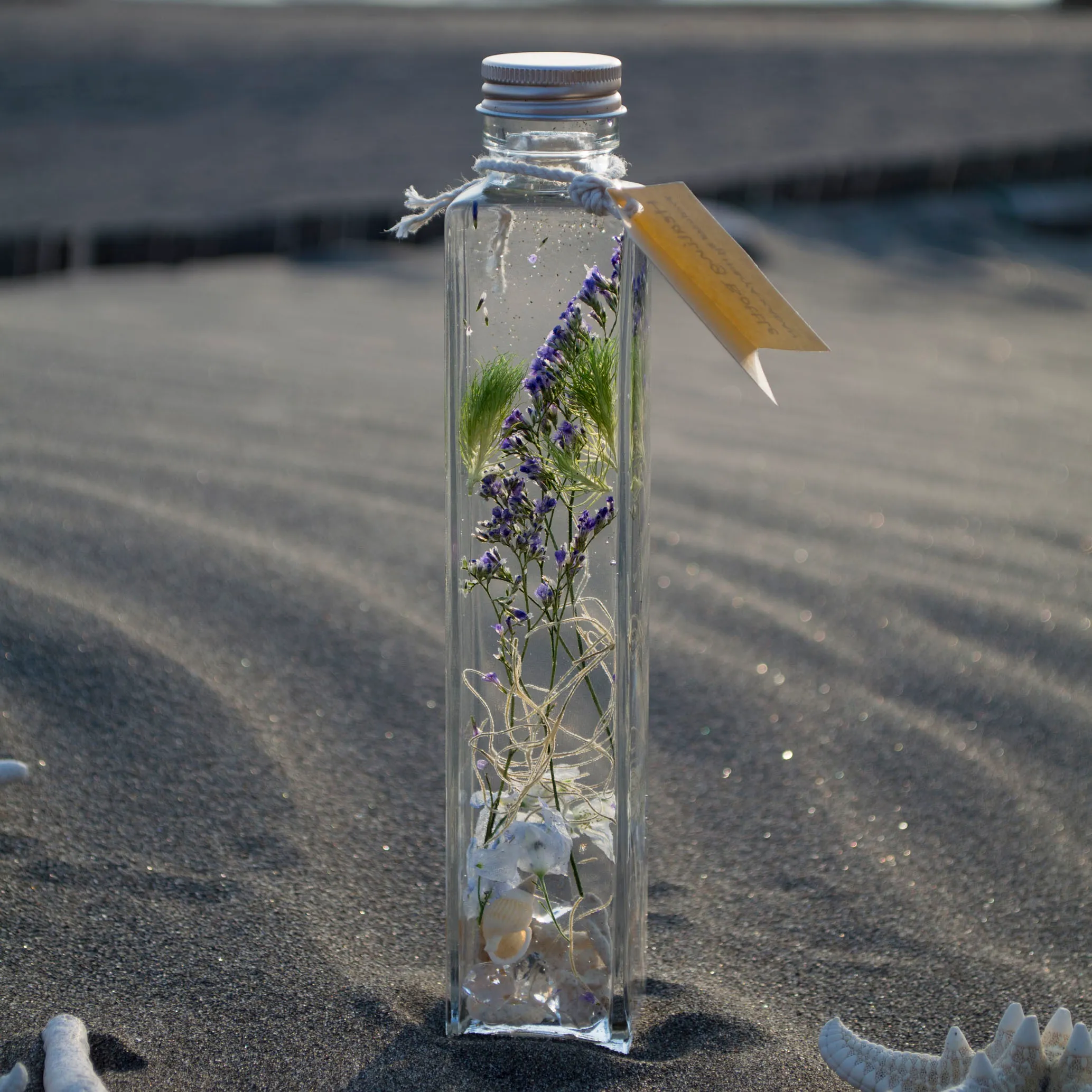 ナチュラルドライ(デルフィニウム・チランジア・ホワイトスター・ブルーファンタジア・てまり草)、サンゴ、クラッシュアイス、インテリアシェル、紙製タグ、特殊オイル