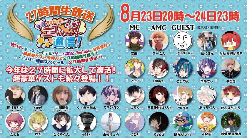そして今回、前回よりも放送時間を3時間増やして「ニコバー通信! SP27時間生放送」を放送する事となりました。20名を超える様々なジャンルのゲストをお呼びして、幅広い世代の方々に楽しんでいただける番組をお送りいたします。