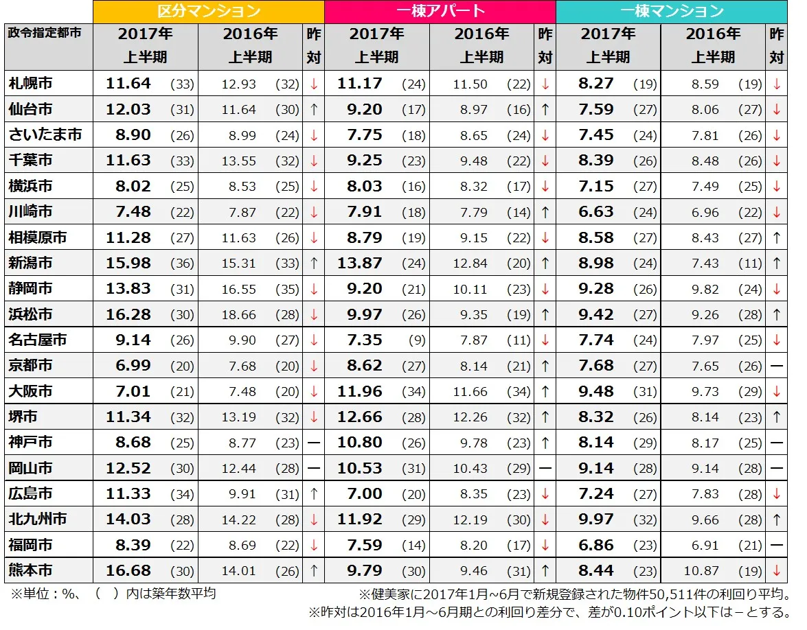 不動産投資と収益物件の情報サイト「健美家(けんびや)」を運営する健美家株式会社(本社:東京都港区、代表取締役社長:倉内敬一)では、同サイトに登録された新規物件を集計し、「政令指定都市別2017年上半期利回り比較」の調査結果をまとめましたのでお知らせいたします。