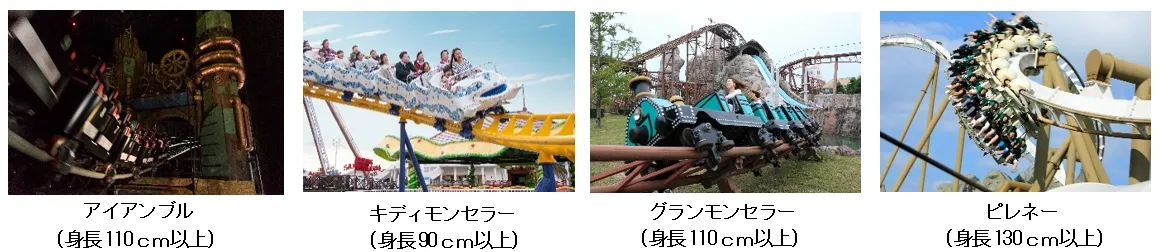 スチームパンクの世界を疾走するインドアコースター「アイアンブル」、コースターデビューにぴったりなキッズコースター「キディモンセラー」、山あり谷ありの本格的マウンテンコースター「グランモンセラー」、吊下げ式ならではのスリルを体感できるインバーテッドコースター「ピレネー」の4機種のコースターをはじめ体験型ウォークスルーアトラクション「3Dトリックツアー」、のんびり癒し系フィエスタ広場を汽車で一周「フィエスタトレイン」など28施設のアトラクションで小さなお子さまから大人の方まで幅広い世代にお楽しみいただけます。