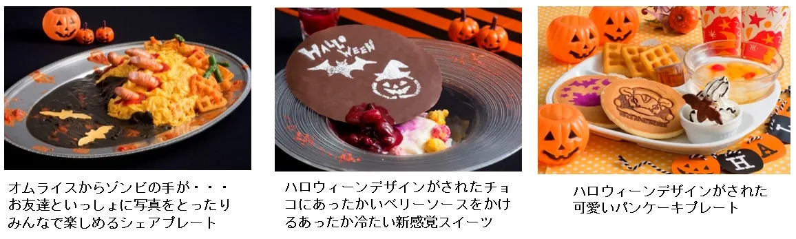 ハロウィーンならではの妖しいメニューや可愛いメニューが新たに登場します。オムライスの中からゾンビの手が妖しく伸びる約40cmのシェアプレートや、ハロウィーンデザインがされたチョコプレートにホットベリーソースをかけて食べるあったか冷たい新感覚スイーツ、ハロウィーンバージョンの可愛いパンケーキプレートがハロウィーン気分を盛り上げます。