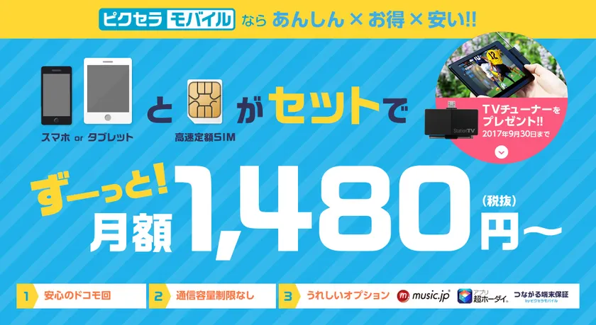 同時に「music.jp」「アプリ超ホーダイ(R)」「つながる端末保証 by ピクセラモバイル」とコラボレーションを開始。オリジナルの高速定額SIMサービスを展開いたします。また、2017年9月30日までにお申し込みいただいたお客様に「モバイルテレビチューナー PIX-DT360」をプレゼント(※1)するキャンペーンも実施いたします。