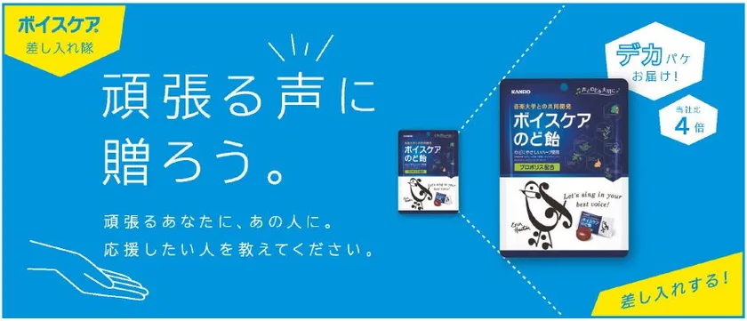 これまで、歌手、声優、合唱など様々な人の“声”を応援してきた「ボイスケアのど飴」は、声を大切にする人を中心にご愛用いただいております。ご自身のために購入されている方の他、約4人に1人の方は、「知人・友人のため」にご購入されているというデータもあり※、アンケートやSNS上にも、「人にあげる」というような“誰かを応援するため”の「差し入れ需要」が伺えます。今回、そのような気持ちと行為を応援するために、「ボイスケア差し入れ隊」を企画いたしました。 ※当社調べ