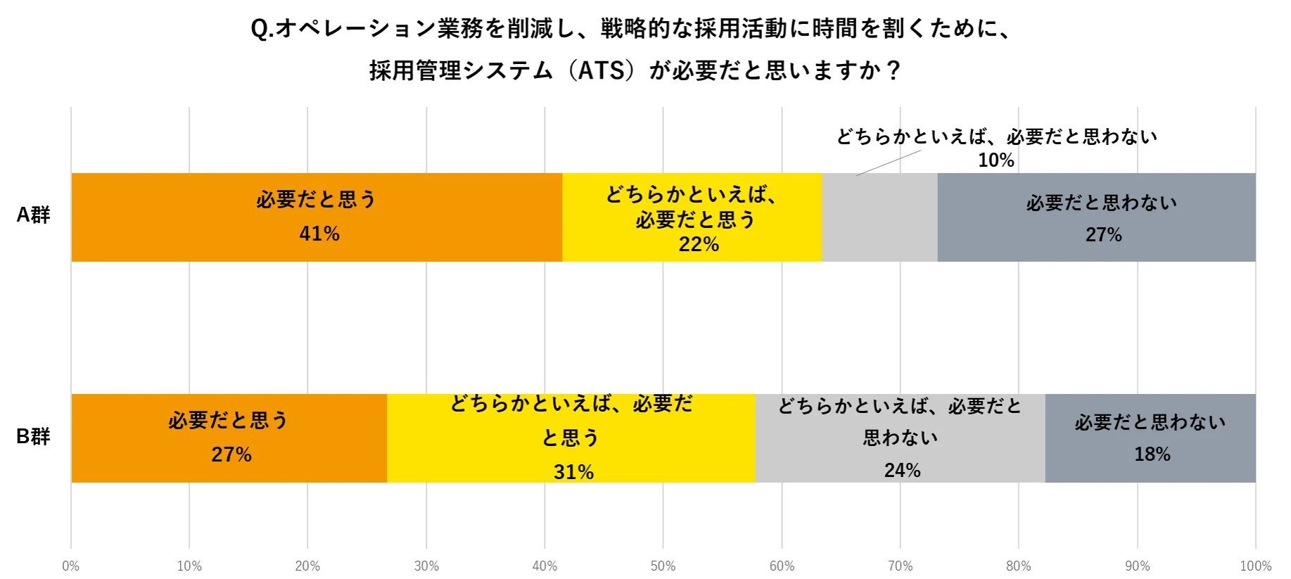 A群、B群のどちらも、約60%の人が、オペレーション業務を削減して戦略的な採用活動に時間を割くために、また採用活動のデータ分析を実施するためには、「採用管理システム(ATS)」が必要であると考えていることが分かりました。