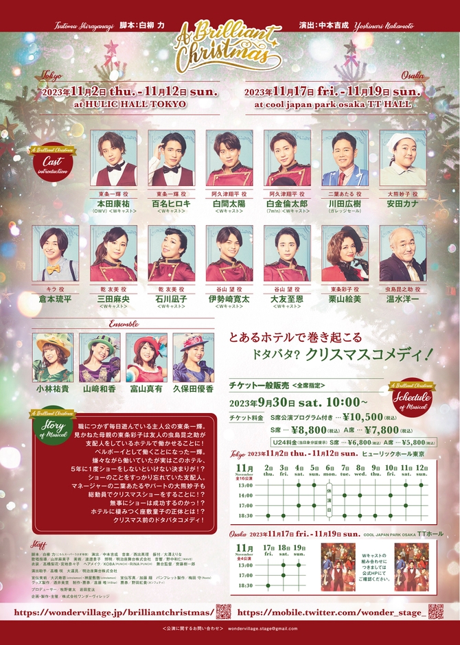 株式会社ワンダーヴィレッジ(東京都港区、プロデューサー牧野健太)主催、舞台『A Brilliant Christmas』が下記の通り上演されます。