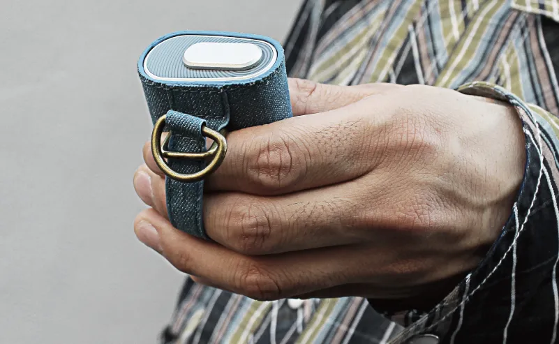 背面に独自構造のストラップが付いた、デニム素材のglo専用保護ケースです。