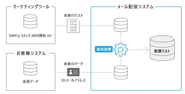 本機能は、メールアドレスを保有しないマーケティングツールから出力された「会員IDリスト」と企業が保有するメールアドレスを含む「会員データ」を「Cuenote FC」が紐づけ、連携にかかる開発負担の軽減、各種マーケティングツールとの連携を可能とします。