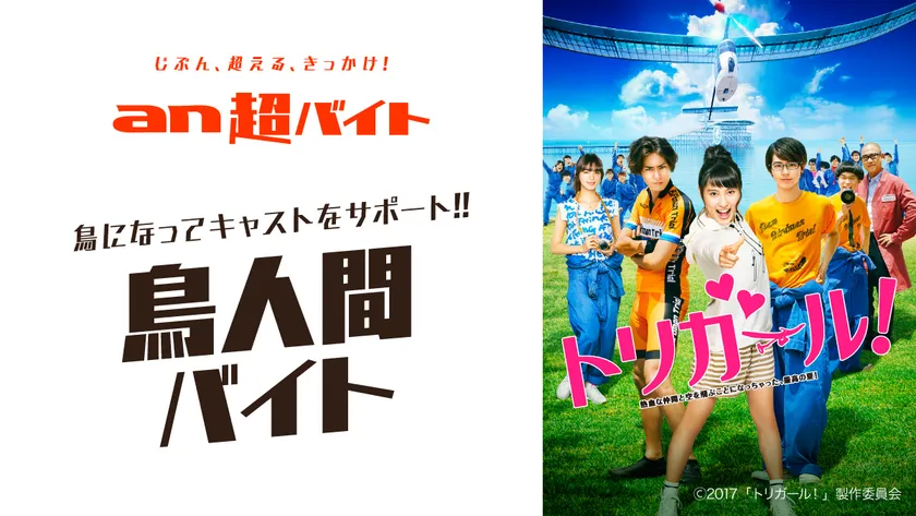総合人材サービス、パーソルグループのパーソルキャリア株式会社(旧社名:インテリジェンス、本社:東京都千代田区、代表取締役社長:峯尾太郎)が運営するアルバイト求人情報サービス「an」< https://weban.jp/ >は、思わず挑戦してみたくなるような「an超バイト」の新企画として、「鳥人間コンテスト」を題材に描いた中村航さん原作の青春部活小説を、土屋太鳳さん、間宮祥太朗さん、高杉真宙さんなど今勢いのある若手キャストで実写化した映画『トリガール!』(2017年9月1日公開)とコラボレーションし、2017年8月2日(水)に東京で開催される映画『トリガール!』のプロモーションイベントでキャストをサポートする“鳥人間バイト”を2名募集します。報酬は、日給5万円と、キャストのサイン入りグッズをプレゼントします。