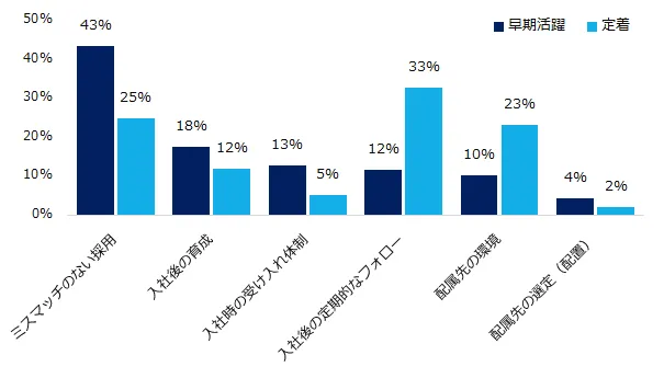 ● 早期活躍にもっとも効く施策、第1位「ミスマッチのない採用(43%)」第2位「入社後の育成(18%)」第3位「入社時の受け入れ体制(13%)」