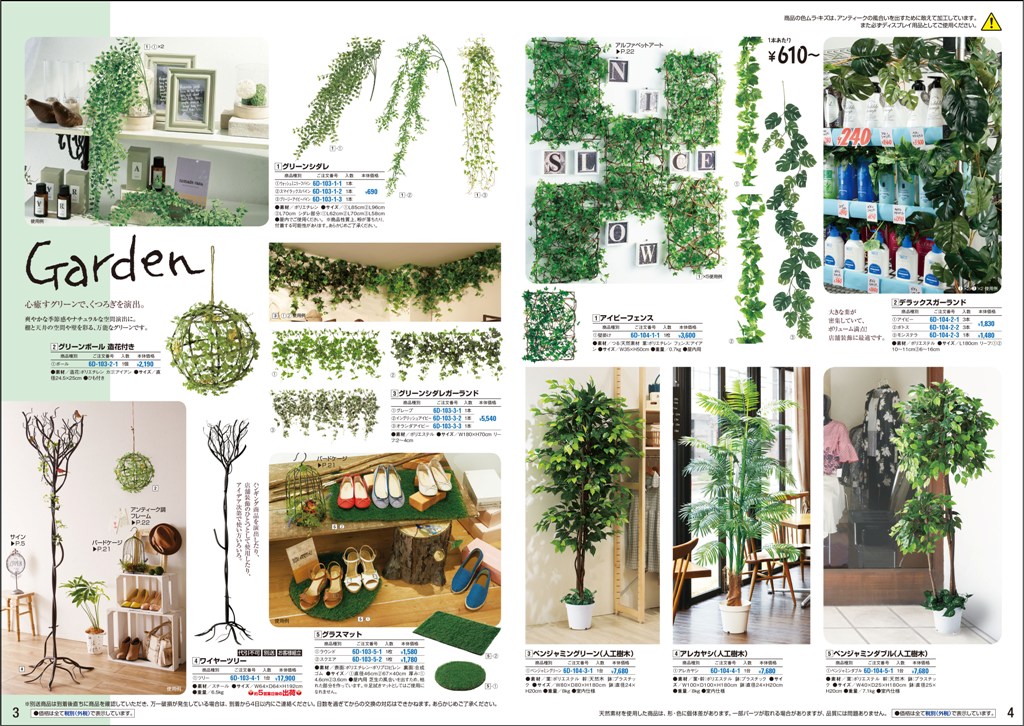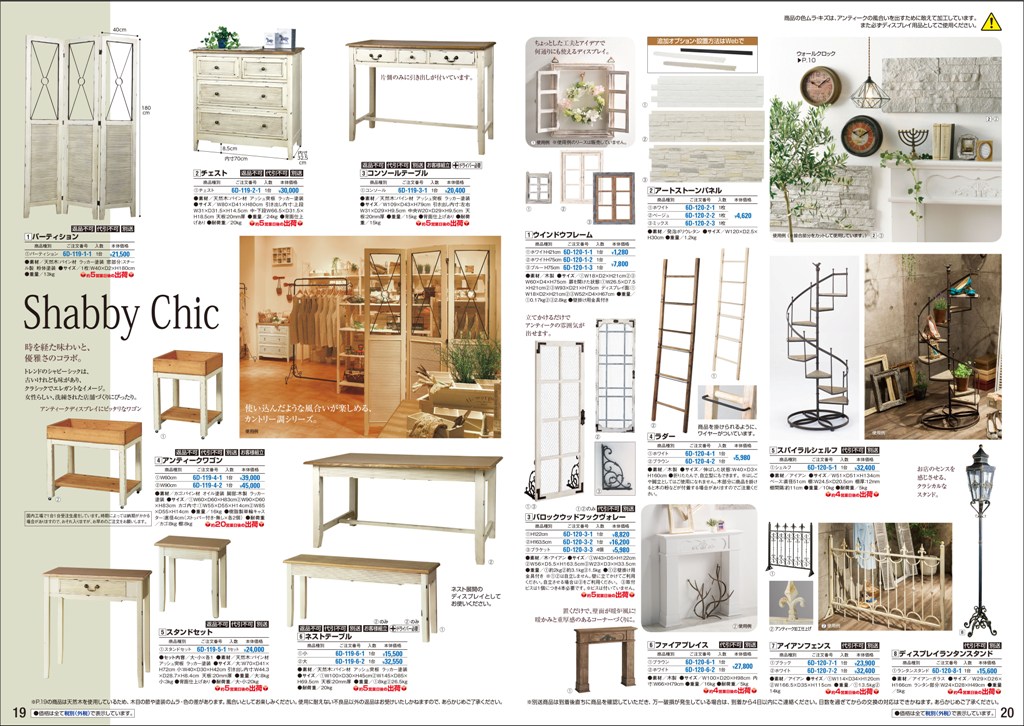 カタログでは、リース・立ち木などのグリーンアイテムや、木製オーナメント・アンティーククロック・ドール、エントランスを飾る個性豊かなマット・ボード・サインアイテムなどを多数掲載しています。またトレンドのインダストリアルテイストを取り入れたラック・サイドボード・壁掛け用サインボードや、シャビーシックイメージのチェスト・テーブル・ボレー・パーティション・テーブルが登場。アイアンのシェルフやスタンドなどの大型品、小物装飾も加わり、おしゃれなお店づくりにおすすめです。