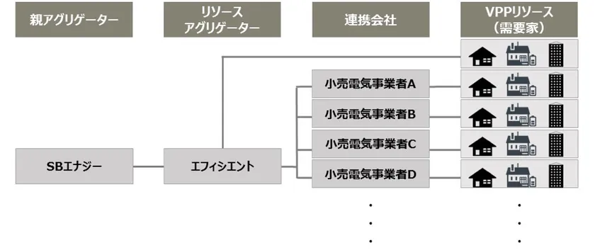 エフィシエントは、リソースアグリゲーターとして親アグリゲーターと連携し、需要家とVPPリソースの制御に関する契約を行い、電力グリッド上の散在する再生可能エネルギー発電設備の統合管理や、蓄電池、空調等に対する遠隔制御・統合管理を行います。
