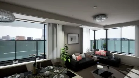 今回、マンションギャラリー内に「VR体感ルーム」を設置し、専用ゴーグルを付け、ご自身の目線で自由に室内を歩いたり、手をかざしたりしてていただくことで、専有部はもちろん、共用部やカラーセレクト体験、上層階からの眺望など、竣工後の様子をリアリティを持って捉えていただけます。