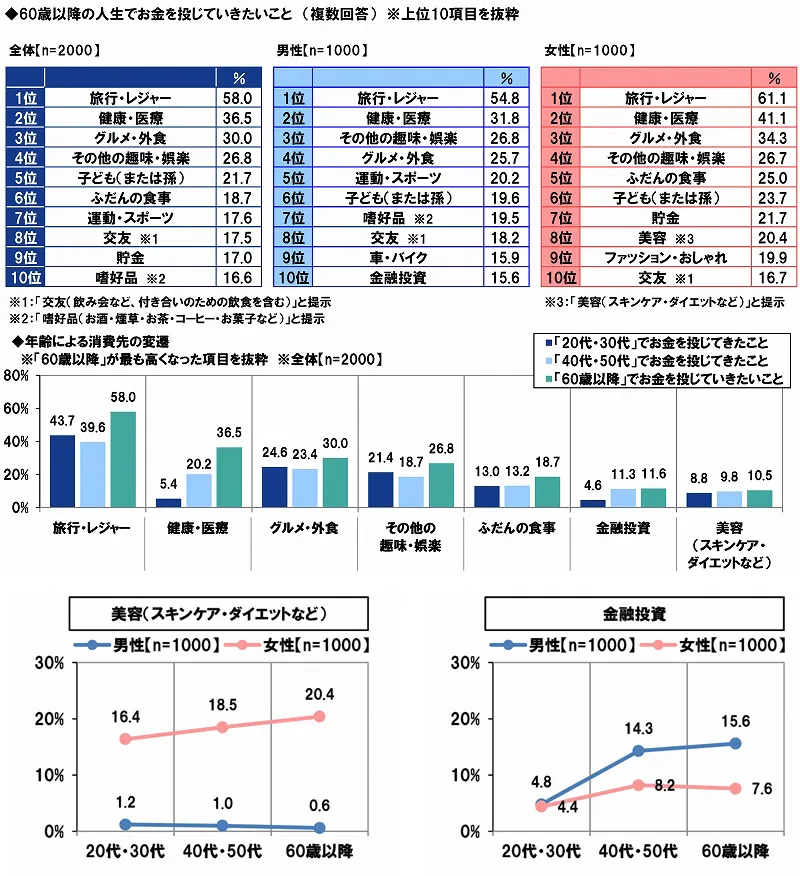 ■今後の人生でお金をかけたいこと 1位「旅行」2位「健康」3位「グルメ」 還暦男性は「金融投資」、還暦女性は「美容」にもお金をかけたい