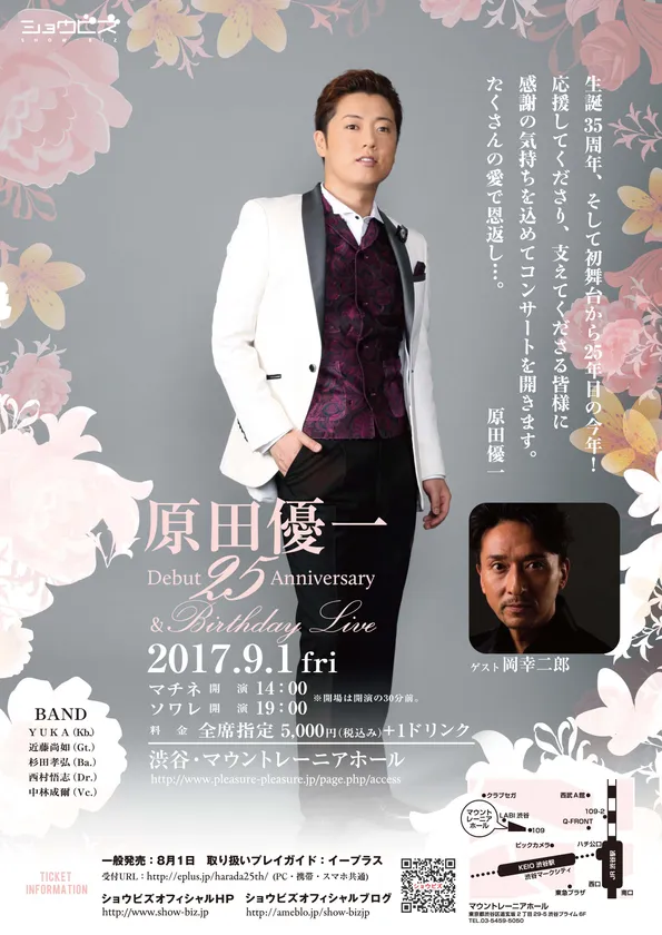 2017年7月26日 13:00株式会社ショウビズ(所在地:東京都世田谷区、代表取締役:坂紀史)に所属し、ミュージカルを中心に活躍する俳優・原田優一(34)がデビュー25周年を記念して、9月1日(金)の誕生日にあわせて、デビュー25周年&バースデー記念ライブを東京・渋谷 Mt.RAINIER HALL SHIBUYA PLEASURE PLEASURE(マウントレーニアホール プレジャープレジャー)にて開催いたします。