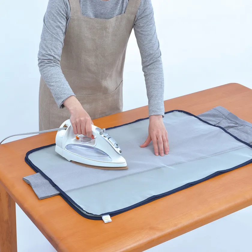 適度なクッション性と滑り止め効果のある裏面により、テーブルの上などでアイロンがけができます。ダイニングテーブルなど高さのあるテーブルを使えば、立った姿勢で楽にアイロンがけが可能です。小さく折りたためるので、収納場所にも困りません。