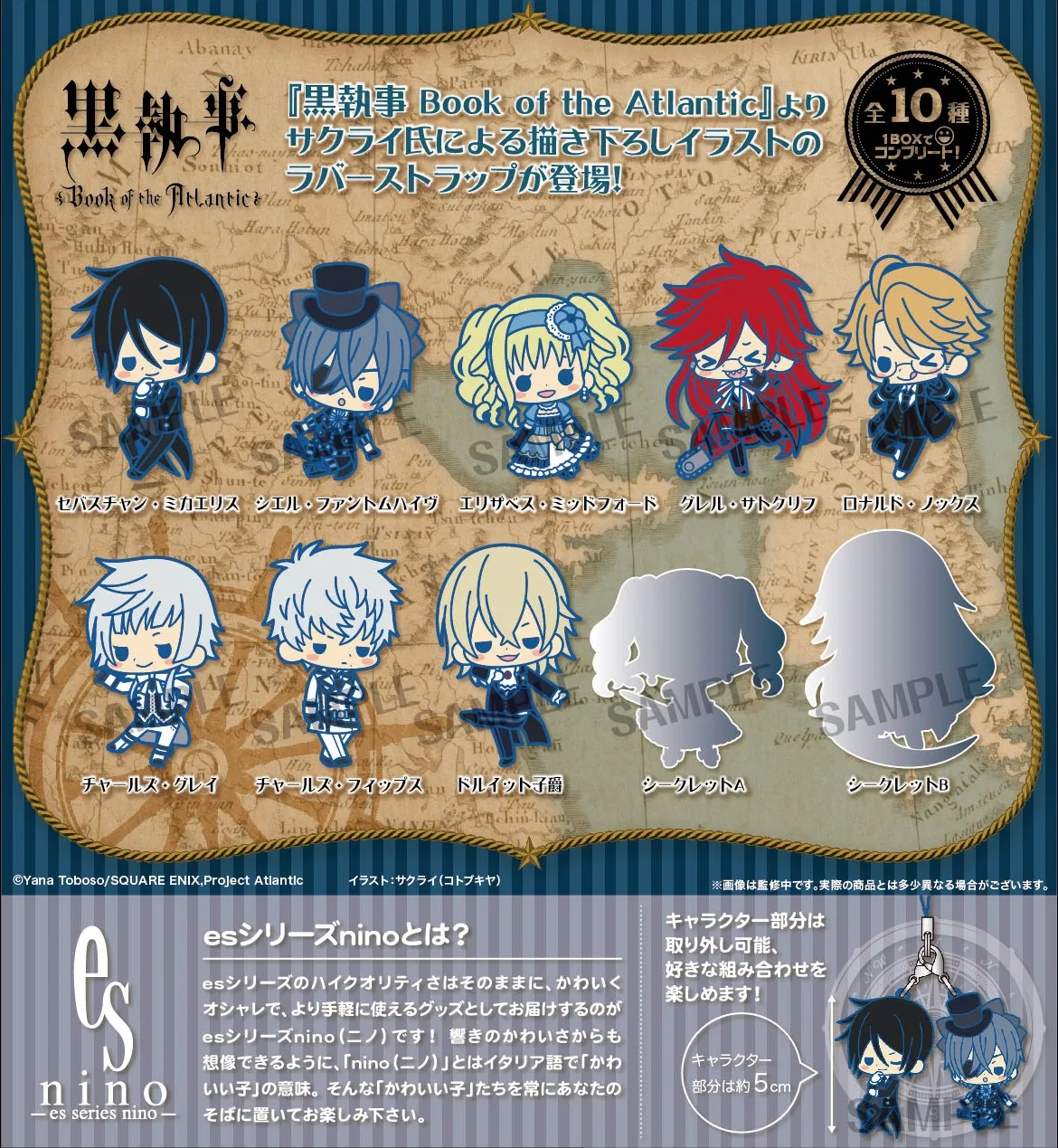 ラインナップは、セバスチャン・ミカエリス、シエル・ファントムハイヴ、エリザベス・ミッドフォード、グレル・サトクリフ、ロナルド・ノックス、チャールズ・グレイ、チャールズ・フィップス、ドルイット子爵、シークレットA、シークレットBの全10種。