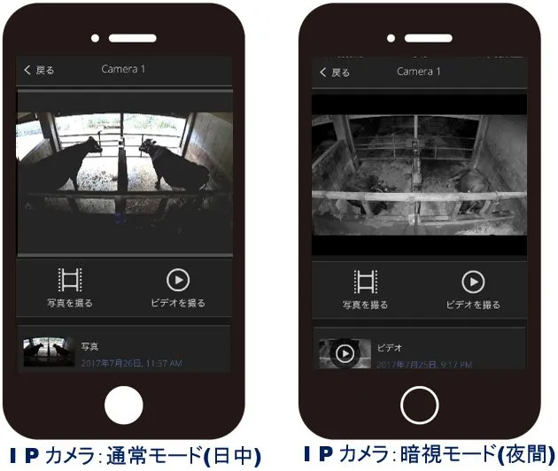 IPカメラ:カメラと赤外線LEDを一体化したカメラ。屋内もしくは軒先に設置し、写真撮影や録画記録など遠隔から現地の状況を確認できます。