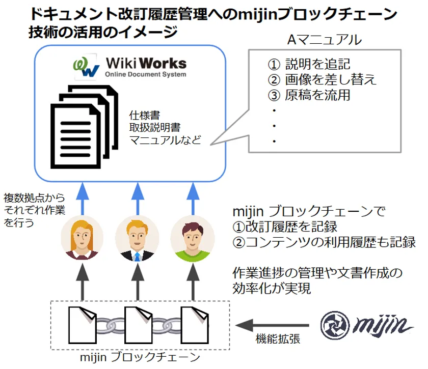 ナレッジオンデマンドは「mijin(R)」を用い、ドキュメントを章やトピック単位に分け、その作成日付や修正・複製・引用・他ドキュメントとの共通化など利用・改訂履歴をブロックチェーン上に記録し、改ざん不可能な形でトレース可能とする、生産性と社内資産活用の向上を目的としたWikiWorksの機能拡張の実現性を検証します。