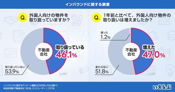 不動産業界特化のDX支援サービスを展開する、株式会社いえらぶGROUP(本社:東京都新宿区、代表取締役:岩名泰介、以下「いえらぶGROUP」)は、不動産会社・エンドユーザーに対して「インバウンドに関するアンケート調査」を実施しました。有効回答1,337件の調査結果を発表します。
