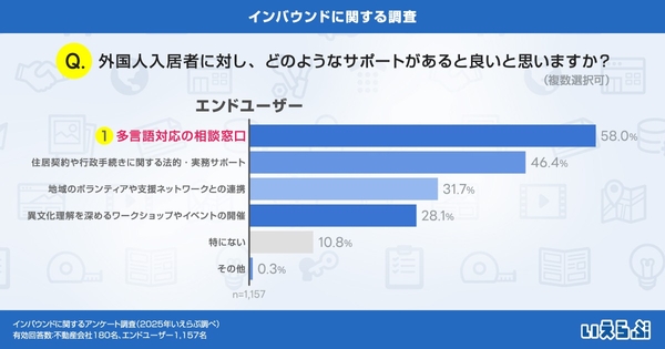 エンドユーザーに「外国人入居者に対し、どのようなサポートがあると良いと思いますか?」と質問したところ、「多言語対応の相談窓口」が58.0%と最多となり、次いで「住居契約や行政手続きに関する法的・実務サポート」が46.4%、「地域のボランティアや支援ネットワークとの連携」が31.7%という結果となりました。