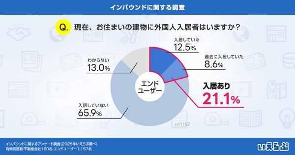 一方エンドユーザーに「現在お住まいの建物に外国人入居者はいますか?」と質問したところ、「入居している」「過去に入居していた」という回答は21.1%という結果となりました。
