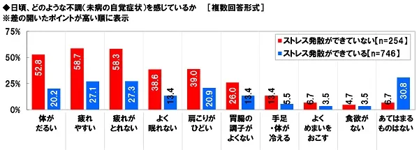 また、ストレス発散ができていない人はそうでない人に比べて、「体がだるい」(ストレス発散ができていない52.8%、できている20.2%)や「疲れやすい」(ストレス発散ができていない58.7%、できている27.1%)、「疲れがとれない」(ストレス発散ができていない58.3%、できている27.3%)で30ポイント以上高くなりました。ストレスをため込んでしまっている人の中には、体のだるさや疲れやすさを感じたり、疲れがとれにくいと感じたりしている人が多いようです。そのほか、「肩こりがひどい」(ストレス発散ができていない39.0%、できている20.9%)や「胃腸の調子がよくない」(ストレス発散ができていない26.0%、できている13.4%)でも差が開きました。
