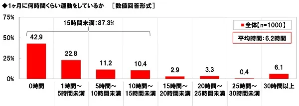 まず、1ヶ月に何時間くらい運動をしているか聞いたところ、「0時間」は42.9%、「1時間~5時間未満」は22.8%、「5時間~10時間未満」は11.2%、「10時間~15時間未満」は10.4%となり、それらを合計した「15時間未満」は87.3%、平均時間は6.2時間となりました。4割強の人が全く運動をしておらず、1日30分に満たない人(月に15時間未満)が9割弱と、ほとんどのようです。