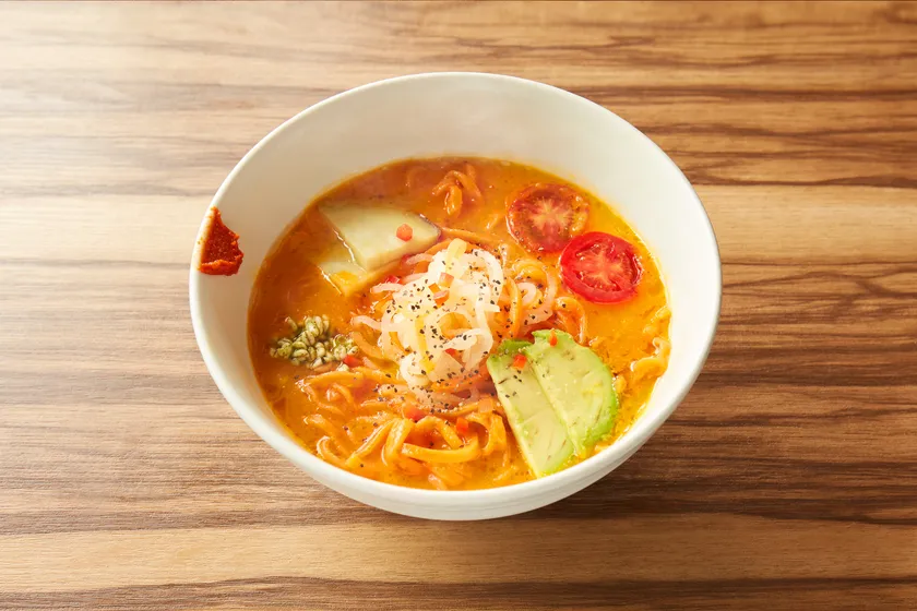 同店で提供される看板メニューは、ソラノイロの代名詞「べジソバ」です。キャベツ・ニンジン・トマトからとった出汁(べジブロス)の濃厚スープ、パプリカを練りこんだオレンジ色の麺、トッピングには味わい・食感・色も鮮やかな野菜。スープ・麺・トッピングの全てに野菜を使用したビーガンラーメンです。動物性食材を一切使用せずに、野菜本来の濃厚な味わいを存分に楽しめるよう仕上げました。