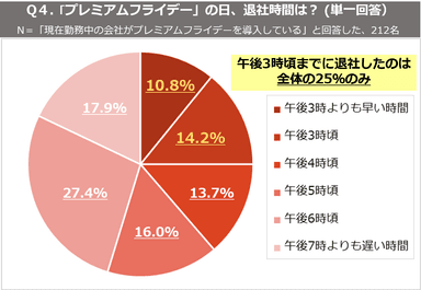 「終業時間を午後3時に早めて退社する」というのがプレミアムフライデーの基本方針ですが、実際の退社時間について、「午後6時頃」と回答した方が27.4%でもっとも多く、次いで「午後7時よりも遅い時間」と回答した方が17.9%、「午後5時頃」と回答した方が16.0%であり、就業時間が9時~17時と仮定した場合、定時帰社とほぼ変わらない状況だった方が全体の61.3%であったのに対し、「午後3時より早い時間」と回答した方が10.8%、「午後3時頃」と回答した方が14.2%で、実際に15時に退社したのは、全体の25%でした。