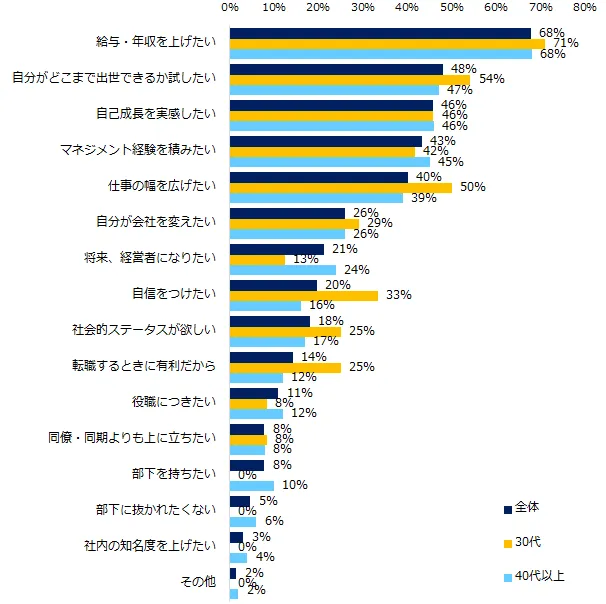 出世意欲がある方にその理由を伺ったところ、第1位は「給与・年収を上げたい」(68%)、第2位は「自分がどこまで出世できるか試したい」(48%)、第3位は「自己成長を実感したい」(46%)。年代別の項目では、30代は「仕事の幅を広げたい」(50%)、「自信をつけたい」(33%)、「社会的ステータスが欲しい」(25%)、「転職するときに有利だから」(25%)、40代以上は「将来、経営者になりたい」(24%)といった項目のポイントが目立ちました。出世意欲がない方の理由でもっとも多かったのは、「出世にこだわらずに働きたいから」(39%)でした。年代別では傾向の違いはありませんでした。