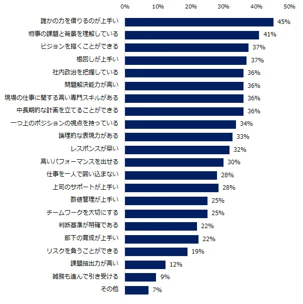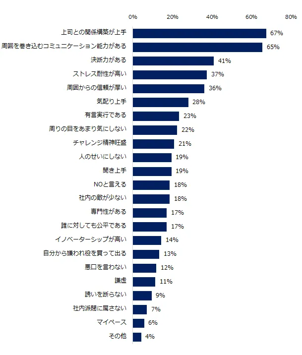 出世する人の共通する特徴について伺いました。人柄は「上司との関係構築が上手」(67%)、次いで「周囲を巻き込むコミュニケーション能力がある」(65%)でした。仕事の仕方は、「誰かの力を借りるのが上手い」(45%)が最多でした。社内で上司や同僚から多くの協力を得られる方が、出世しやすいことが見受けられます。