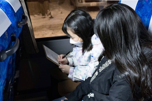 子どもたちはバスに乗車し、氷瀑ライトアップツアーへ出発しました。子どもたちが向かったのは、湧き水が凍り付いた奥入瀬渓流の名所「馬門岩(まかどいわ)」です。当体験会では、ネイチャーガイドが奥入瀬渓流の環境や、氷瀑の成り立ちを紹介しました。この日ガイドを務めたのは、当ホテルのネイチャーガイドです。ネイチャーガイドは冬の奥入瀬渓流と氷瀑の魅力を工夫を凝らしながら子どもに伝え、子どもたちはネイチャーガイドから自然の壮大さを学びました。馬門岩にできる氷瀑の青く幻想的に照らし出された景色を目の前に、子どもたちは自然とライトが融合し、織りなされる地元の絶景に目を輝かせながら楽しみました。