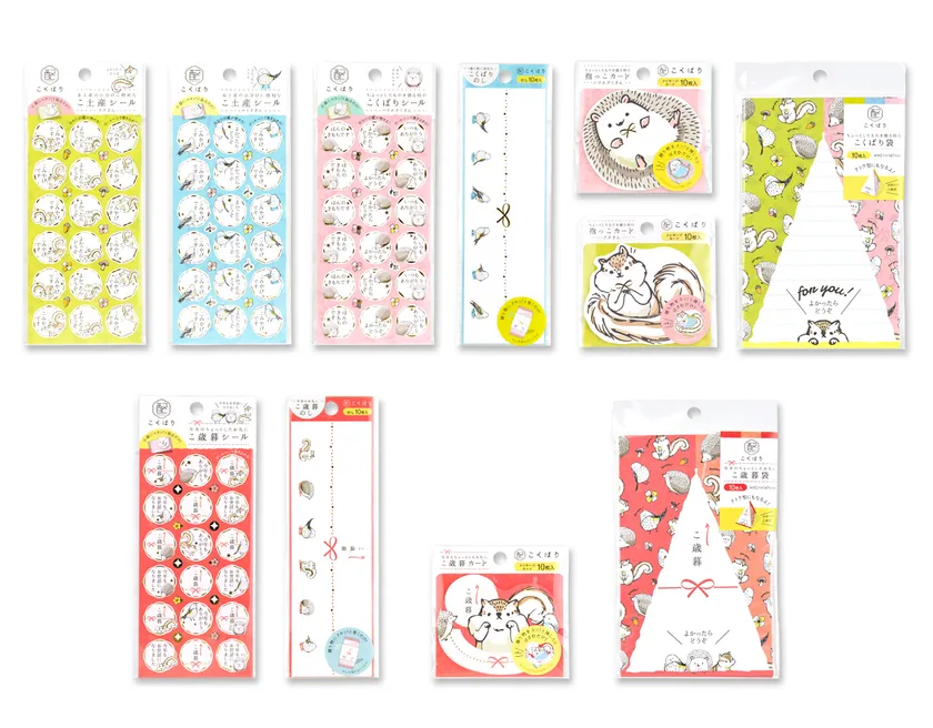 「こくばり」ラッピングアイテムシリーズの中には、ちょっとしたお土産を配る時に便利な「こ土産」(シール)と、ちょっとした御歳暮を贈るのに便利な「こ歳暮」(シール・カード・のし・袋)があり、特定のシーンで活躍します。